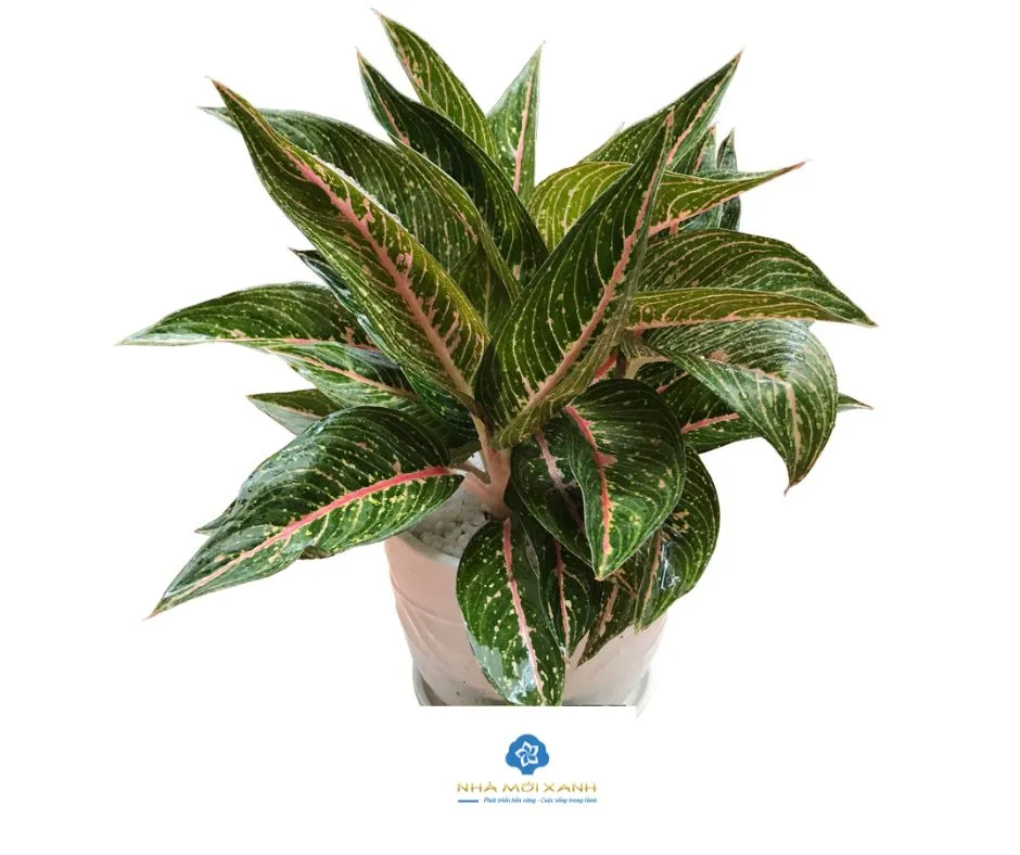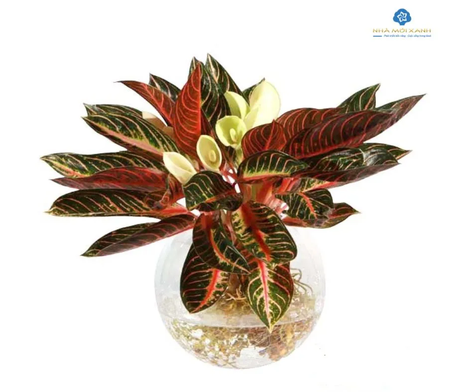 • Lá cây: Lá có màu xanh đậm, bóng mượt, hình trứng thuôn nhọn ở đầu, mang đến sức sống mãnh liệt. Điểm nhấn đặc biệt là những đốm vàng li ti trên bề mặt lá và gân lá màu hồng tím, tạo nên sự tương phản màu sắc hài hòa và đẹp mắt.